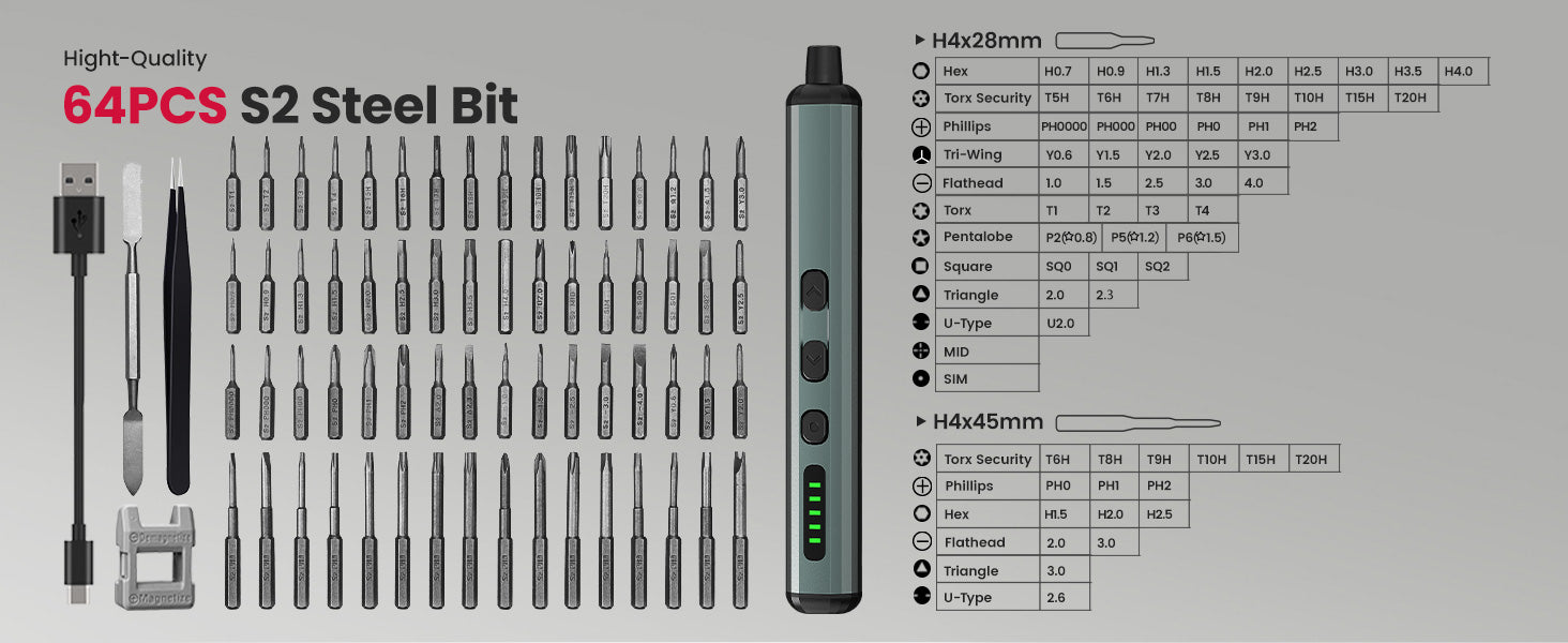 Accessories & Applications: This electric screwdriver kit comes equipped with 64 precision bits, featuring 12 models in 2 lengths, effortlessly handling a variety of screws and holes. It includes an integrated magnetizer, magnetic pad, metal scraper, tweezers, and a USB-C charging cable. Suitable for a range of precision instruments such as smartphones, laptops, cameras, drones, watches, and more.