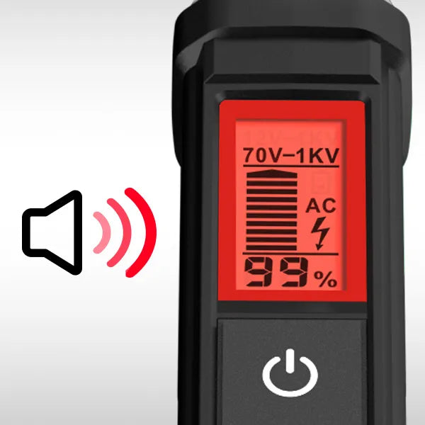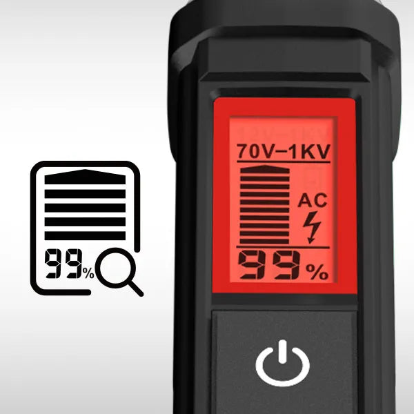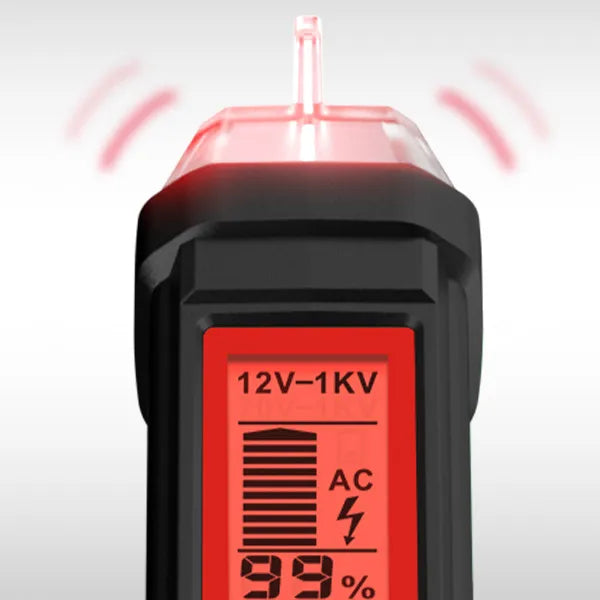 This voltage detector pen sends out multiple alarms through sound and light. When the voltage is detected, the tip will send out red light and beep. When the higher the sensed voltage is, or the closer it is to the voltage source, it beeps at a higher frequency and the percentage value will be larger. At the same time, the screen will be red or green, red means high voltage and live wire are detected, green means low voltage and null wire are detected.