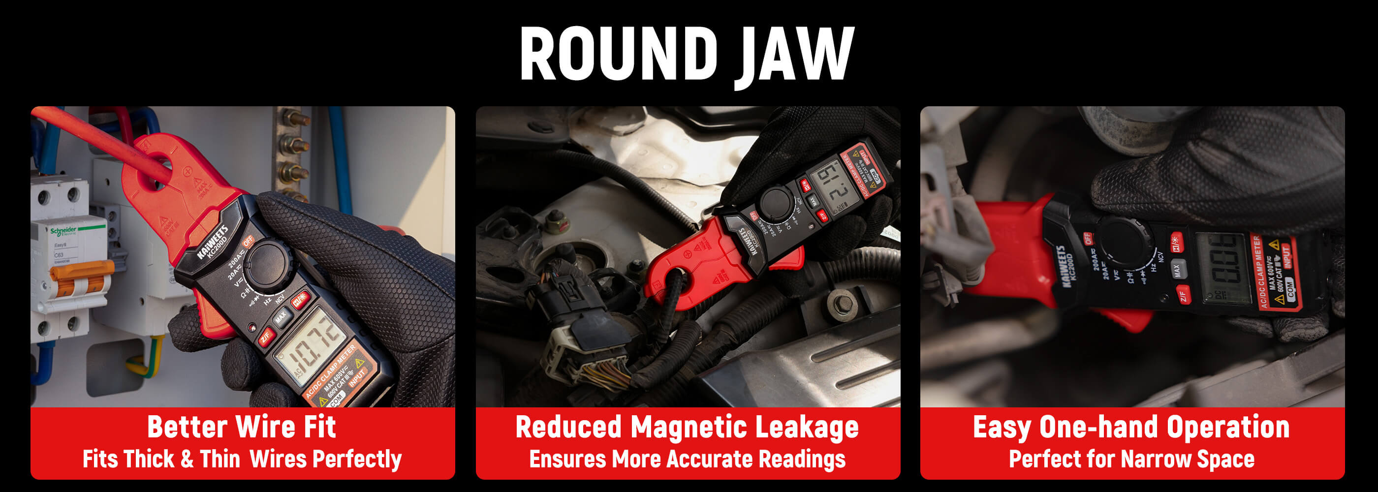 Round Jaw Clamp Meter for Multi-Size Wires: No Loose Grips! Unlike standard flat-jaw models that struggle with uneven diameters, our universal round jaw securely holds thick wires (EV battery cables, HVAC compressor lines) and thin wires (household wiring, device cords) alike. Enjoy accurate readings for home maintenance AND industrial repairs—no compromise on fit or precision.