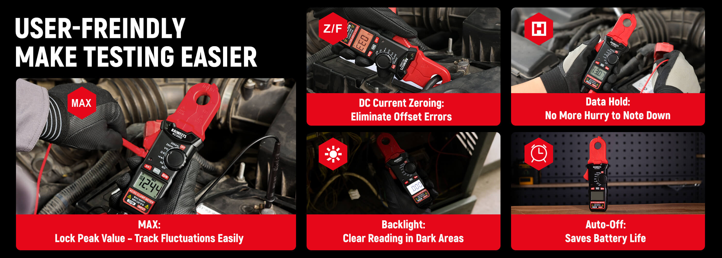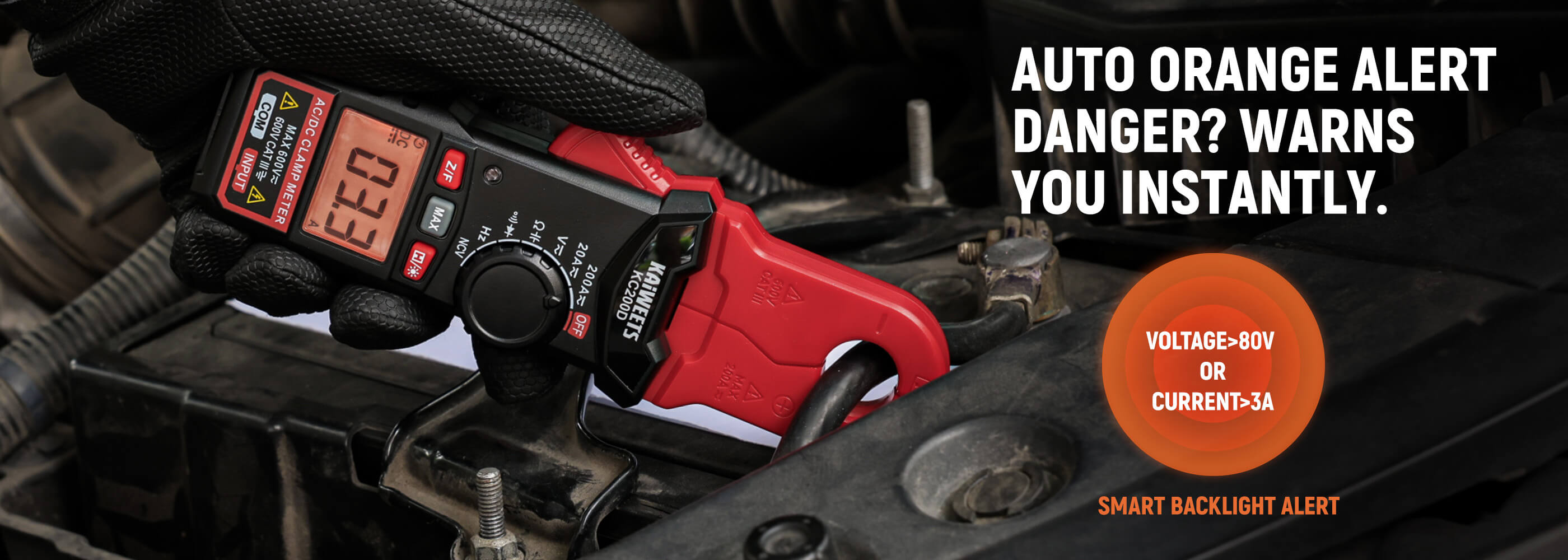 5-in-1 Practical Functions: Streamline testing with built-in must-haves: ① MAX Lock Peak Value – Track current fluctuations for motor repair (catch issues faster); ② DC Current Zeroing – Eliminate offset errors for precision; ③ Data Hold – Freeze readings instantly (no rush to jot down); ④ Auto Orange Backlight Alert – Lights up when Voltage >80V/Current >3A, warning of high-power risks (ideal for industrial/HVAC tasks); ⑤ Auto-Off – Saves battery life for long-term use.