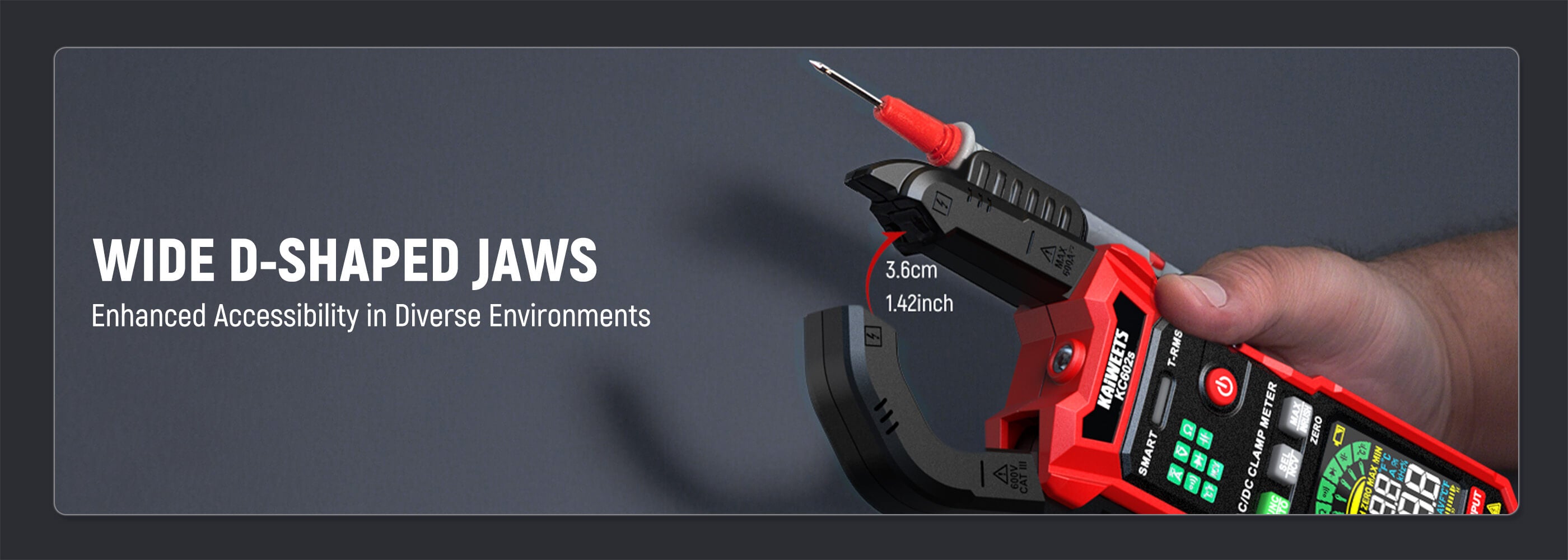 Extra-Large Jaw Design: Boasts a spacious jaw that can accommodate conductors of various sizes, allowing for quick and safe AC/DC current measurements without interrupting the circuit. Simply clamp around a single live wire to obtain accurate readings efficiently.
