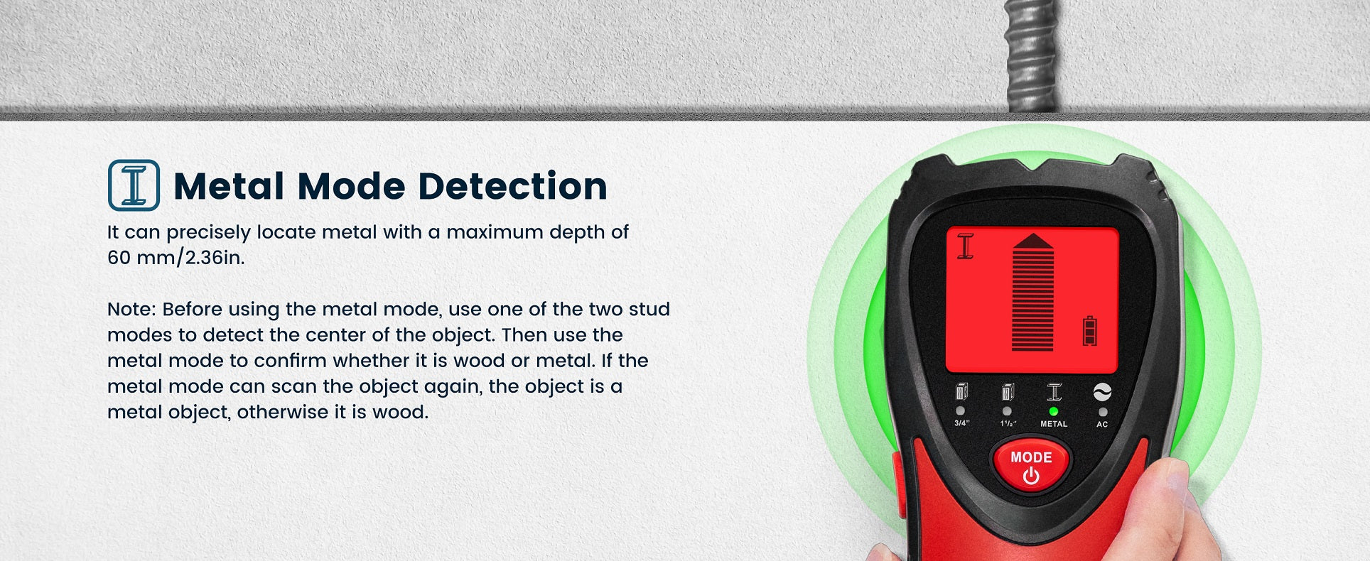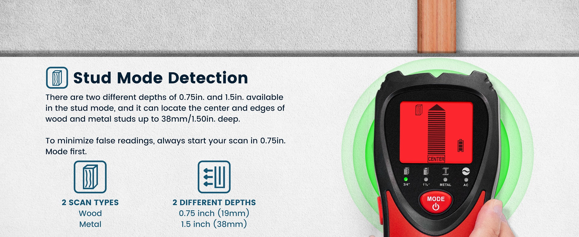 5-in-1 Multi-functional: The stud detector has 5 scanning modes for different needs, including 3/4" and 1-1/2" scanning mode, metal scanning mode, AC scanning mode, and buzzer mode.