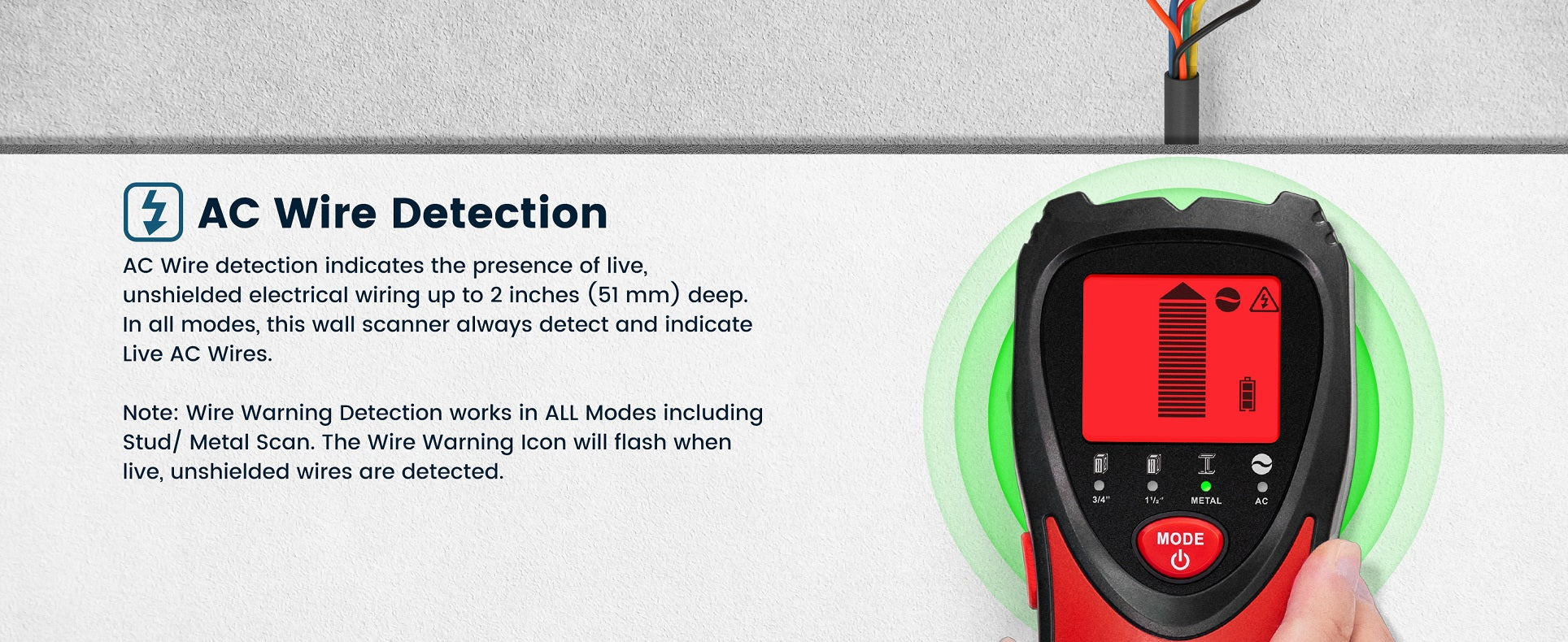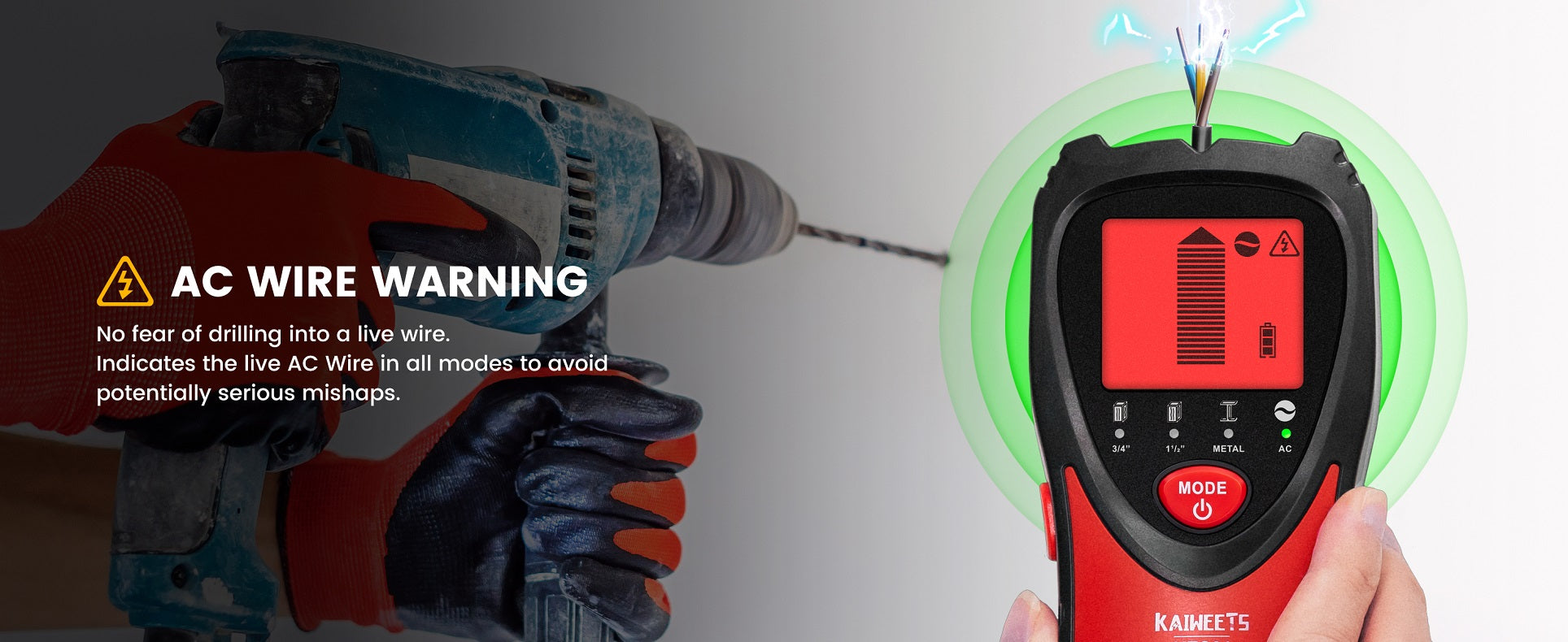 Safety First: KAIWEETS stud sensor indicates the live AC wire in all modes to keep you away from AC wires and avoid drilling into electrical wires.