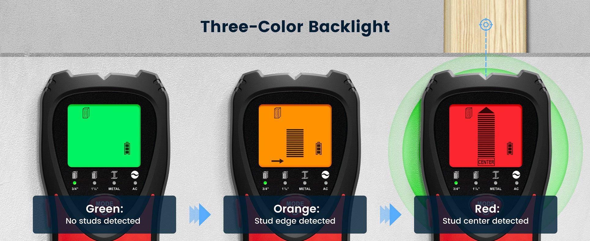 Tricolor Backlight: This wall scanner comes with an upgraded tri-color backlight LCD that gives you clear direction and accurate location of targets. Green: No studs detected; Orange: stud edge detected; Red: stud center detected, and the buzzer will sound an alarm at this time.