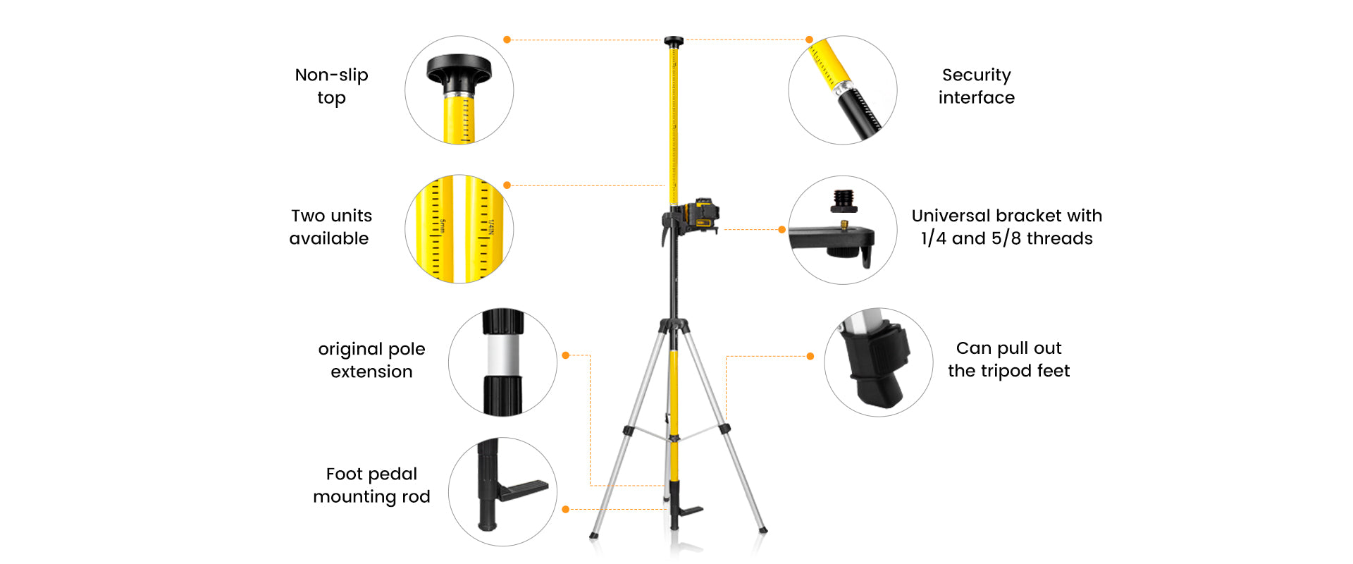 The rod can be used in many places, e.g. at home, on the construction site, etc. where laser work is required. Their interface has 1/4 "and 5/8" threads, which are suitable for almost all lasers.