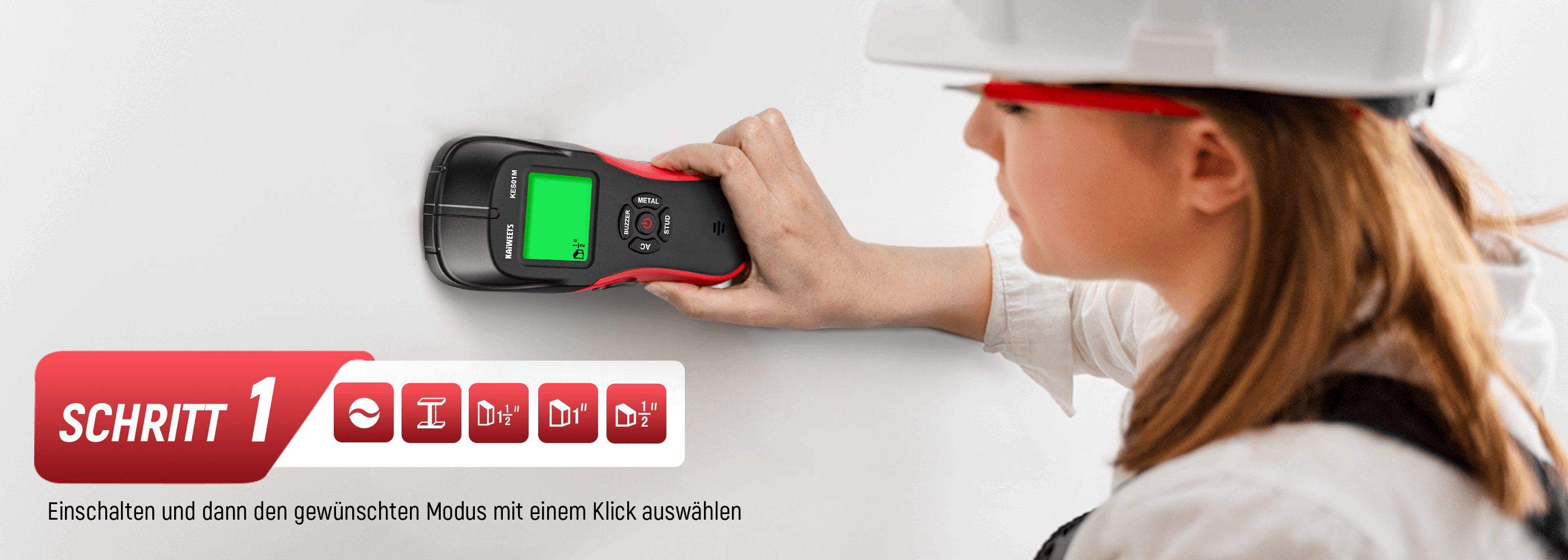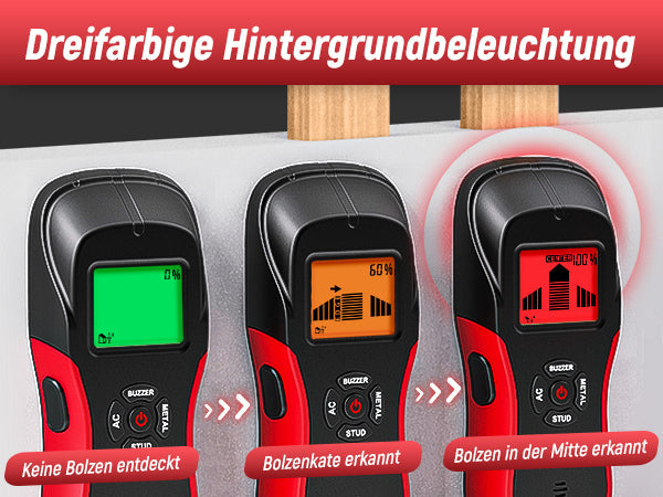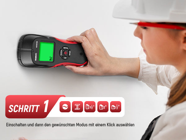 6-in-1 Modes: The finder offers multiple modes for detecting bolts (12mm, 25mm, 38mm), non-ferrous and magnetic metals, and live AC cables, with depths up to 60mm for ferrous metals, 80mm for non-ferrous metals, and 20" for AC cables.