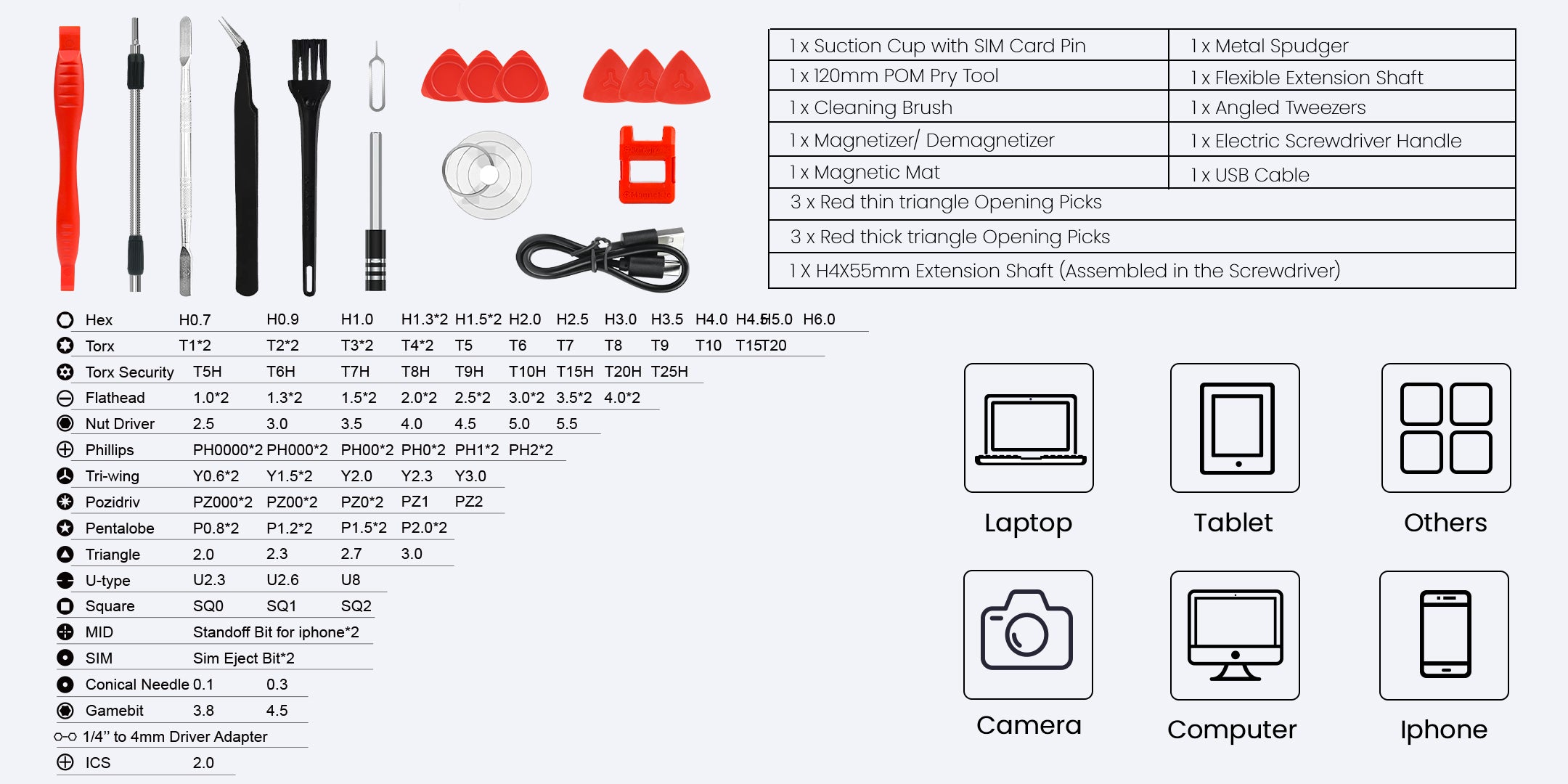 This electric screwdriver set has 137 units: including 120 precision CRV silver nickel bits, 1 Suction Cup with SIM Card Pin, 1 Metal Spudger, 120mm POM Pry Tool, 1 Flexible Extension Shaft, 1 Cleaning Brush, 1 Angled Tweezers, 1 Magnetizer/ Demagnetizer, 1 Electric Screwdriver Handle, 1 Magnetic Mat, 1 USB Cable, 3 Red thin triangle Opening Picks, 3 Red thick triangle Opening Picks, 1H4X55mm Extension Shaft (Assembled in the Screwdriver).