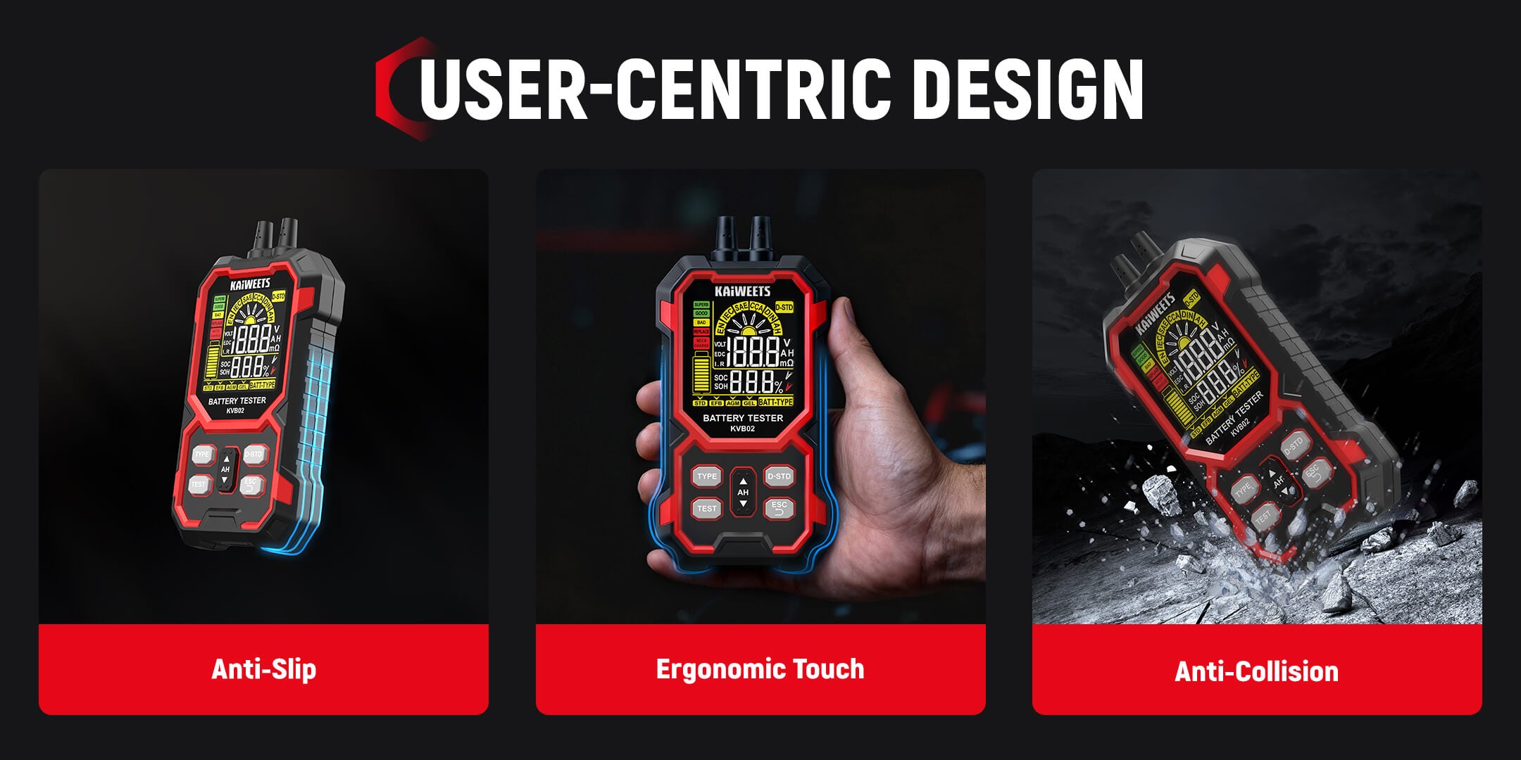 User-Friendly Design: Unlike most monochrome LCD testers, the KAIWEETS battery load tester features a 2.68 inch color display that’s clear even in direct sunlight, reducing eye strain. Single-hand operation makes testing quick and convenient. Just connect to your vehicle battery—no charging required. Built with a durable TPE+ABS case, it resists drops and impacts for long-lasting use.