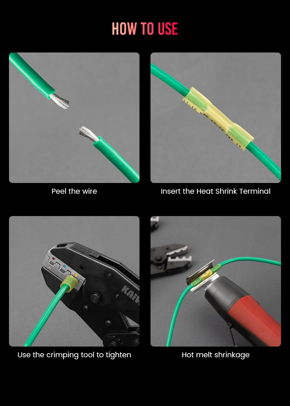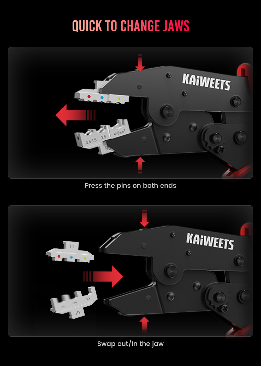 Upgraded Crimping Tool: One crimping tool can be used for heat shrink connectors and insulated electrical connectors(AWG 22-10). Equipped with two types of high-precision jaws. Press the upper and lower pins simultaneously and the jaws will slide out. No need to use a screwdriver, saving you time.