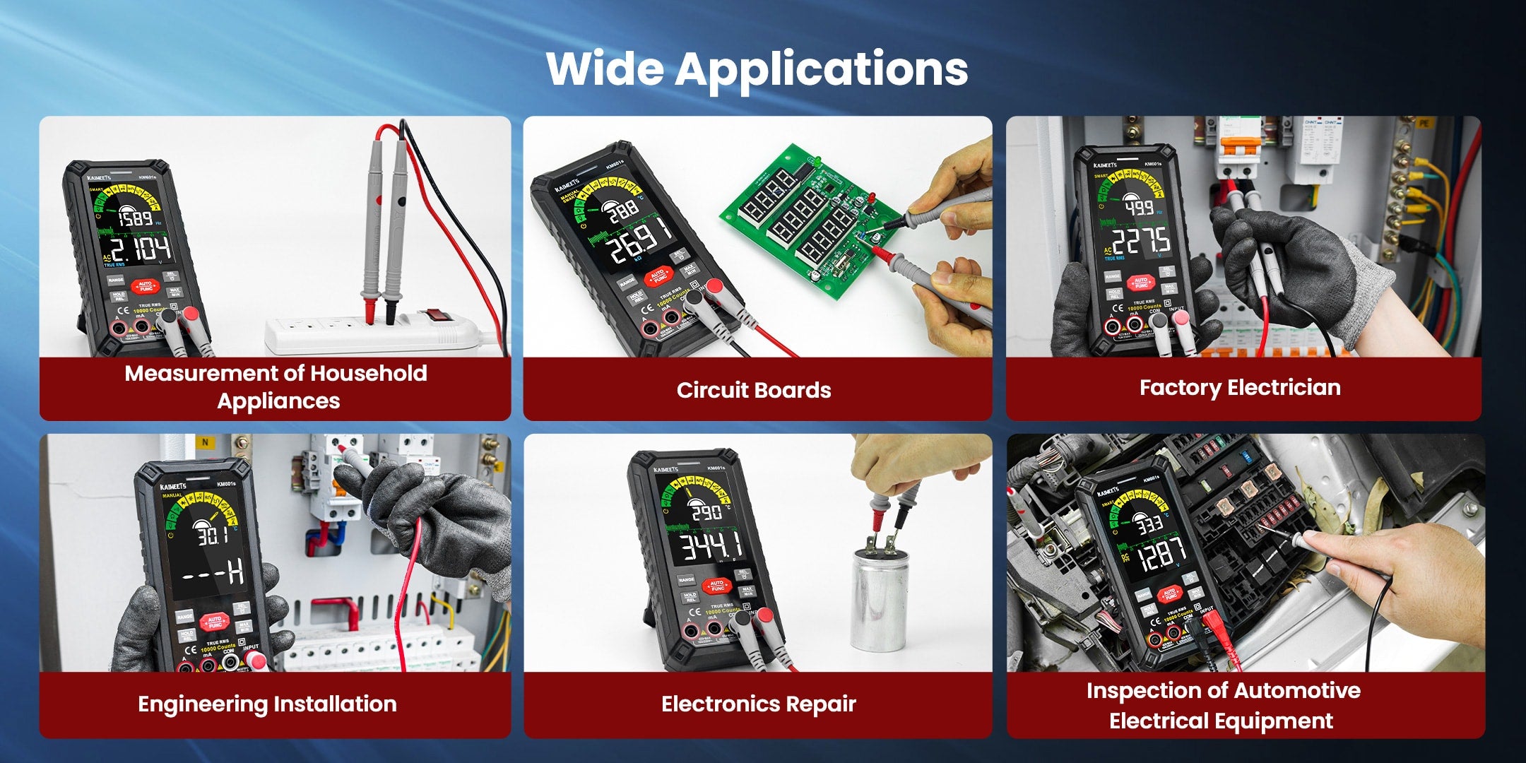 Breite Anwendung: Das intelligente Digitalmultimeter eignet sich zur Diagnose von Problemen mit der Automobil-, Industrie- und Haushaltselektrik. Das Multimeter kann Wechsel- und Gleichspannung, Widerstand, Durchgang, Wechsel- und Gleichstrom, Kapazität, Frequenz, Diode, Arbeitszyklus, Temperatur, NCV und stromführende Leitung genau messen.